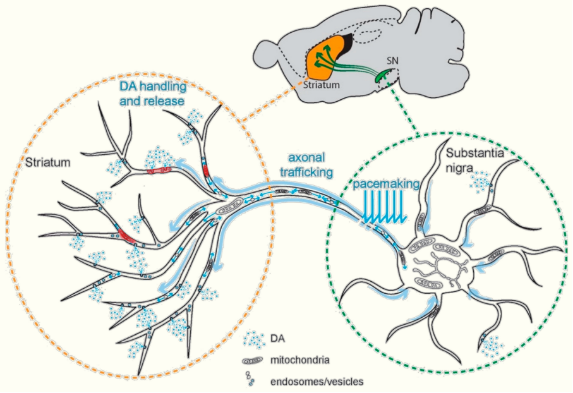 DA neurons are particularly vulnerable to neurodegeneration because of their physical structure and size. Each dopaminergic neuron has a very extensive and complex axonal arborescence reaching from the substantia nigra (SN) to far into the striatum, delivering dopamine to more than a million synapses. The energy required to support this intense activity is provided by about 2 million mitochondria in the axons and synapses concerned. Any local mitochondrial dysfunction can lead to an energy shortage and degeneration of the more distant axons.