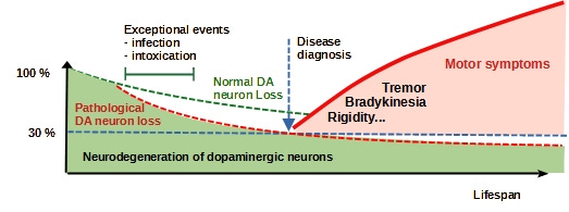 Normal (green dashed line) neuron loss with age does not lead to Parkinson’s. Excessive (red dashed line) DA neuron loss caused by exceptional events can lead to the loss of more than 70% of axons and the appearance of motor symptoms.